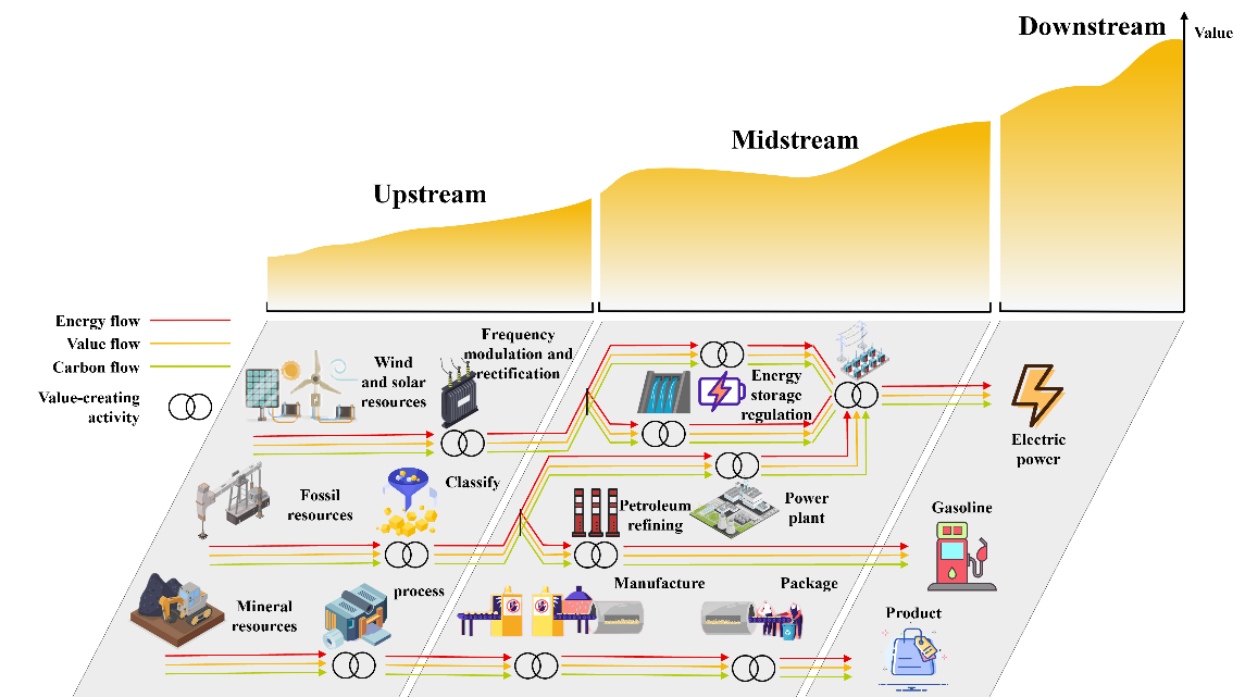 价值链分析是企业优化运营和决策的重要工具。随着可持续发展理念在世界范围内得到认可,价值链研究也越来越关注可持续性。传统上,能源管理与价值管理并行不悖,交集有限。然而,自2015年《巴黎协定》提出实现净零排放的目标后,碳管理已成为国家战略不可或缺的一部分,传统价值链需要重新审视。本文引入“能源价值链”这一新概念,将能源消耗与价值创造和碳排放融为一体,强调“能源流”、“价值流”和“碳流”之间的耦合关系。通过对电力、钢铁、石油和交通运输等行业现有价值链的回顾,定义了各行业特定的能源价值链,并讨论了其合理性和有效性。这种集成分析方法为行业或企业优化能源消耗、减少碳排放、增强竞争优势提供了战略工具。