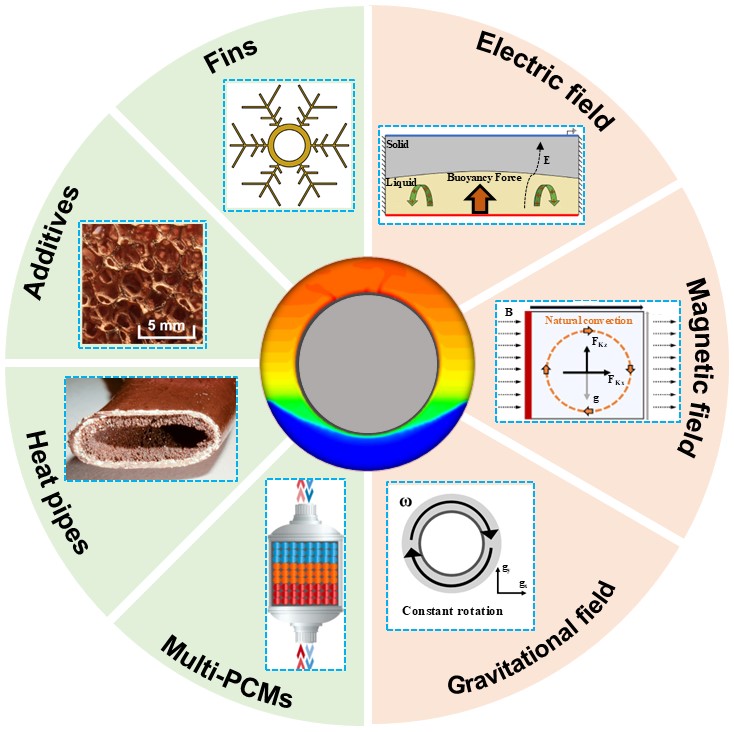 潜热储能(LTES)是缓解能源来源与能源供应之间差异的重要储能技术,在太阳能利用、地热能利用和电力存储等许多领域都有着巨大的应用前景。然而,LTES系统受到大多数相变材料(PCM)导热系数低的困扰,威胁着其大规模商业应用。为了应对这一挑战,LTES系统的传热强化至关重要,并已在世界范围内进行了广泛的研究。对流传热强化技术,包括翅片、纳米颗粒和多种PCM,可以显著提高LTES系统的充放电速率。最近,基于旋转的方法应运而生,为LTES系统的传热强化提供了新的途径,世界各地的研究人员已经取得了许多成果。本研究对三种基于旋转的传热强化方法的机理和应用进行了简要综述,旨在深入了解这些新型传热强化方法并推动其未来的发展和应用。